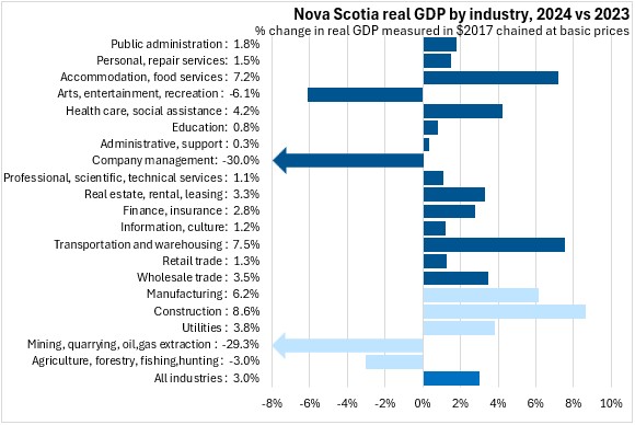 The fastest growing industry in Nova Scotia's economy in 2024 was construction. Although mining, oil and gas along with company management reported the largest declines in real GDP, these two industries are relatively small. Among larger industries, agriculture/forestry/fishing, repair/mantenance, and arts/entertainment/recreation reported the fastest real GDP declines in 2024.