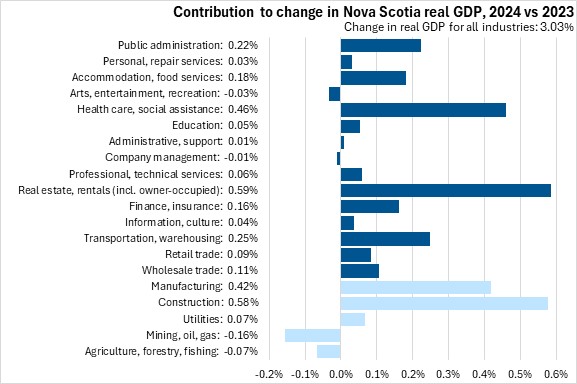 Based on size as well as change, real estate (including imputed rental GDP from owner-occupied dwellings) made the largest positive contribution to Nova Scotia's real GDP growth in 2024. This was followed by construction, manufacturing, and health care/social assistance (including daycare). The largest downward pressures on Nova Scotia's real GDP in 2024 came from mining and agriculture/forestry/fishing.