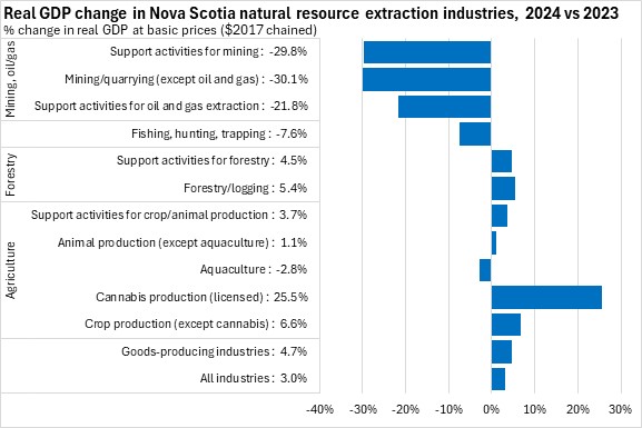Real GDP was up for agriculture (small decline for aquaculture) and forestry in Nova Scotia in 2024, while there was a decline in fishing output. Mining/quarrying, as well as support activities for mining and oil/gas were down in 2024.