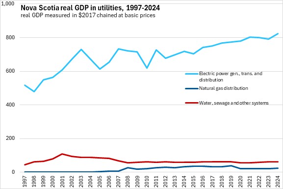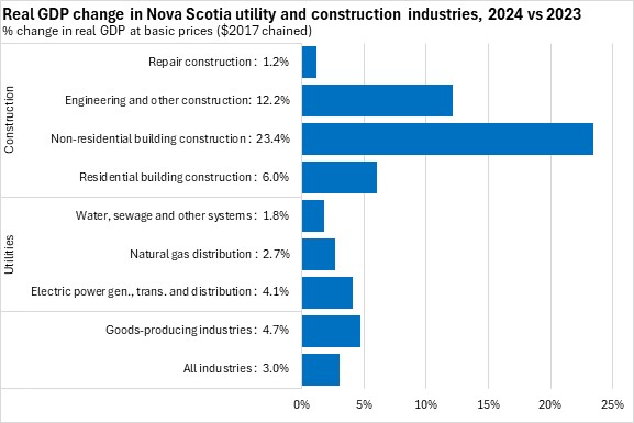 Nova Scotia's utilities real GDP was up for all subsectors, with faster growth for electric power than natural gas or water/sewage. GDP was up among all construction industries, with the strongest growth among the non-residential building construction.