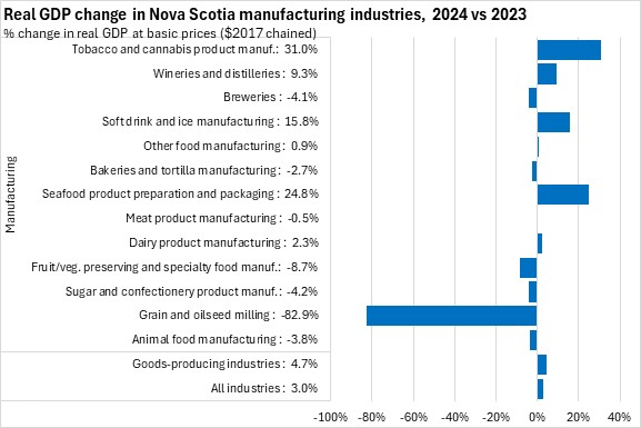 Real GDP was down in 2024 for many of Nova Scotia's food and beverage manufacturing industries, however, this was more than offset by a large increase in GDP from the seafood production preparation industry. The steepest decline was among grain and oilseed milling and strongest gain in tobacco and seafood product manufacturing.