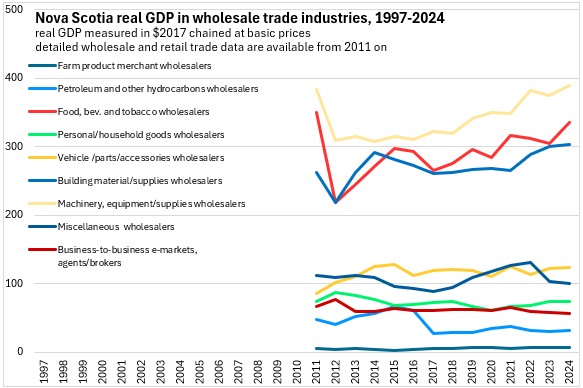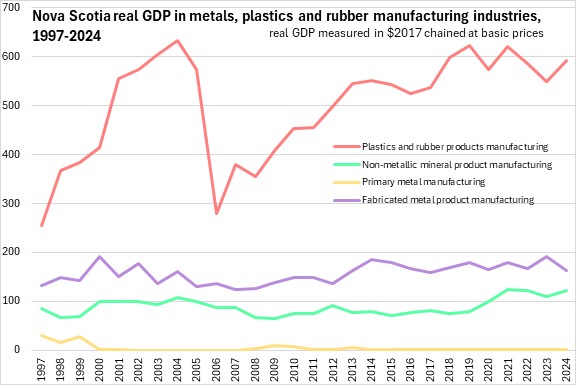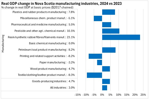 Rubber, plastics, resin/synthetic rubber, reported a notable rise in real GDP in 2024. There were declines in real GDP from Nova Scotia's textiles, clothing and printing manufacturing industries last year. Real GDp was up for wood products, but down for paper manufacturing.