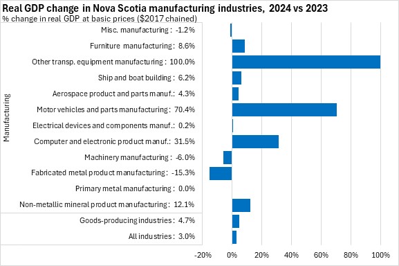 Nova Scotia's sizable aerospace and shipbuilding industries reported GDP gains. Real GDP increased significantly for Nova Scotia's motor vehicles and parts manufacturing, computer/electronics as well as in other transportation equipment (small value to start with) manufacturing, with declines among fabricated metal and machinery manufacturing.