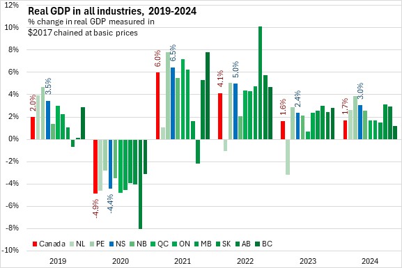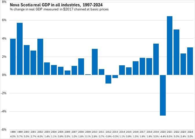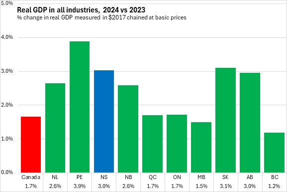 Nova Scotia's real GDP increased 3.0% in 2024, third fastest among provinces behind Saskatchewan and Prince Edward Island. Nationally, real GDP grew by 1.7%. All provinces reported rising real GDP in 2024 with the slowest gain in British Columbia.