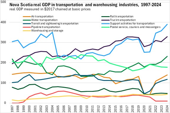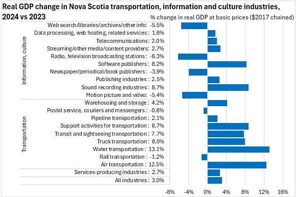 In transportation, all subsectors except rail and postal service/couriers reported growth, with the fastest gain for water transportation. In information/culture industries, software publishing and sound recording posted larger gains in real GDP. There were notable declines in real GDP from Nova Scotia's radio/television broadcasting motion picture/video, newspaper/periodical and web search/libraries/archives industries.