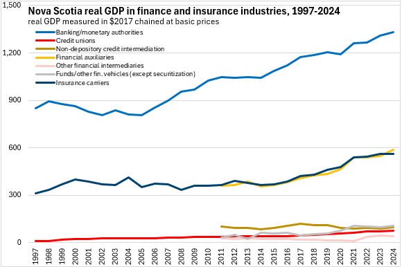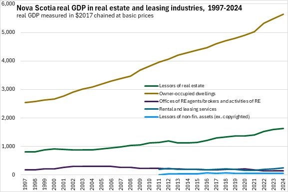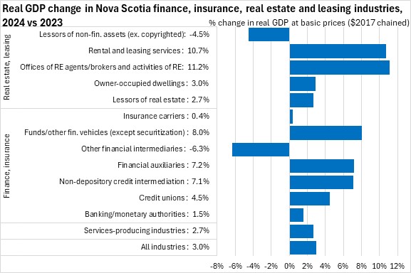 Finance and insurance industries (except other financial intermediaries) posted gains in real GDP 2024 in Nova Scotia. Rental/leasing and offices of real estate agents were up notably in 2024 with the only decline in lessors of non-financial assets (excluding copyrighted assets).