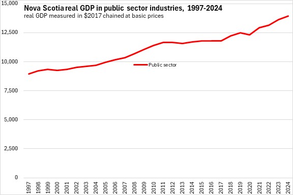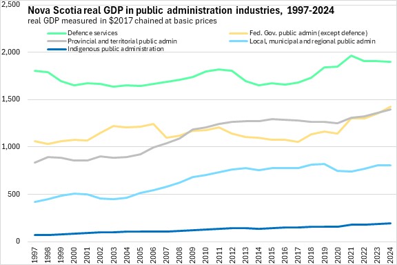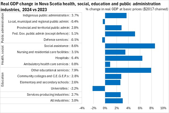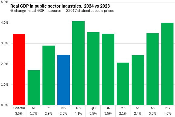Nova Scotia's real GDP from public sector industries (which are a subcomponent of services-producing industries) was up 2.5% in 2024. Nationally, real GDP from the public sector increased by 3.5% with gains in all provinces. New Brunswick and British Columbia reported the fastest rise in real GDP from the public sector while Newfoundland and Labrador reported the slowest gain.