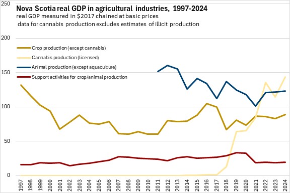 Nova Scotia's real GDP from agricultural industries has grown largely on rising cannabis production (this estimate excludes illicit production). Although there are intermittent periods of faster growth and decline, real GDP from non-cannabis crops has grown slowly while real GDP from animal production has trended down (and has remained relatively flat since 2021). Support activities for crop and animal production have grown modestly until 2019 and have not recovered after a decline in 2021 to pre-pandemic levels.