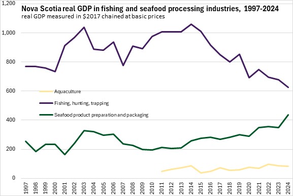 Real GDP from Nova Scotia's fishing and seafood industries has declined in recent years, despite rising export values. Although the volume of output has been lower, these industries have benefited from higher prices in more diverse markets.