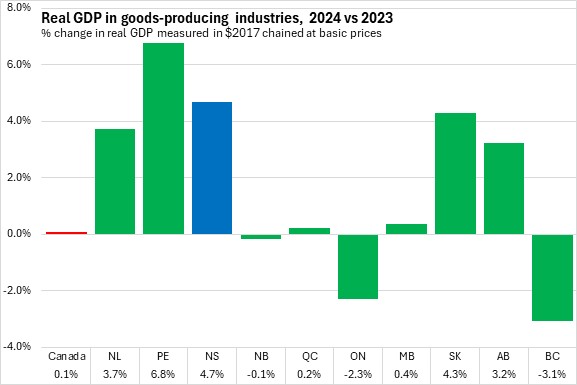 Real GDP from goods industries rose 4.7% in Nova Scotia in 2024. Real GDP from goods industries was up 0.1% nationally with gains in seven provinces. Prince Edward Island reported the fastest increase in real GDP from goods industries in 2024 (followed by Nova Scotia) while British Columbia reported the steepest decline.
