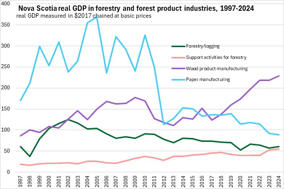 Nova Scotia's forestry and forest product industries have experienced substantial declines in recent decades, particularly with closures of paper production in 2012 and pulp production in 2020. Although real GDP from forestry declined, lumber production volumes increased from 2017 to 2021. Lumber production declined in 2022 and subsequently grew in 2024.