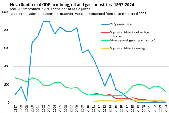 Nova Scotia's oil and gas output peaked in the early 2000s and ended by 2019. Mining and quarrying real GDP declined through 2013, but started to grow again from 2013-2019 before contracting again in the years since.