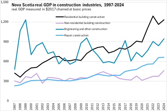 Nova Scotia's real GDP in construction industries has been led by gains in residential building and repair construction, with recent contributions from non-residential construction. Real GDP from engineering construction has been steadily growing since 1997.