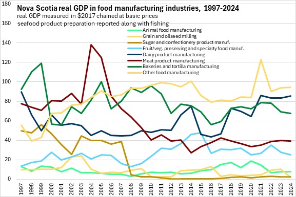 Within Nova Scotia's (non-seafood) food manufacturers, real GDP has been dominated by other food manufacturing category. Most other food manufacturing industries have relatively small real GDP.