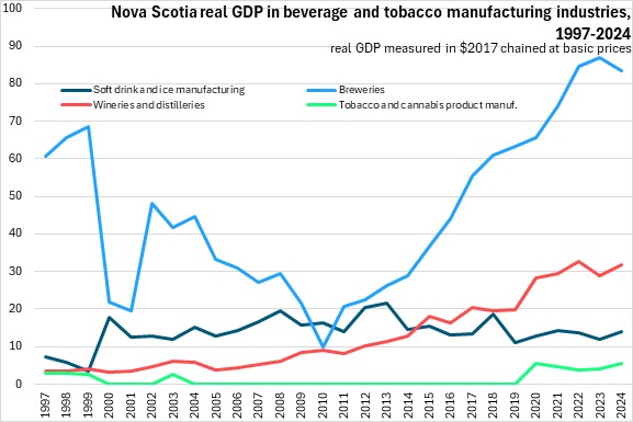 Real GDP from Nova Scotia's beverage and tobacco industries is notably smaller than from many other industries. There has been a notable rise in real GDP from wineries and distilleries (with a decline in 2023). From 2010 to 2023, there was a notable recovery in real GDP from breweries, with a decline in 2024. There has been a recent increase in tobacco and cannabis product manufacturing in Nova Scotia.