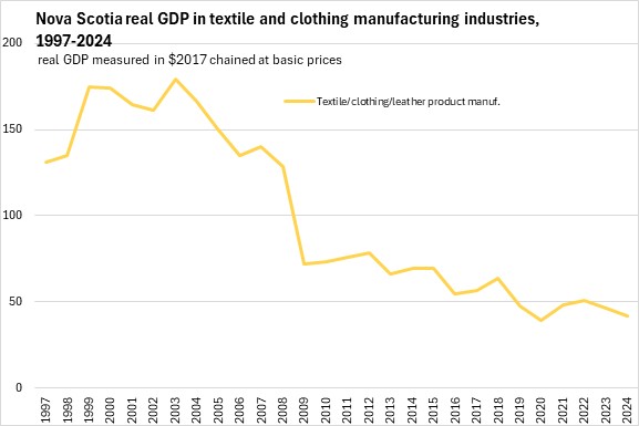 Nova Scotia's textile/clothing/leather product manufacturing reported a sharp decline in output in 2009 and has been on a gradual declining trend since.