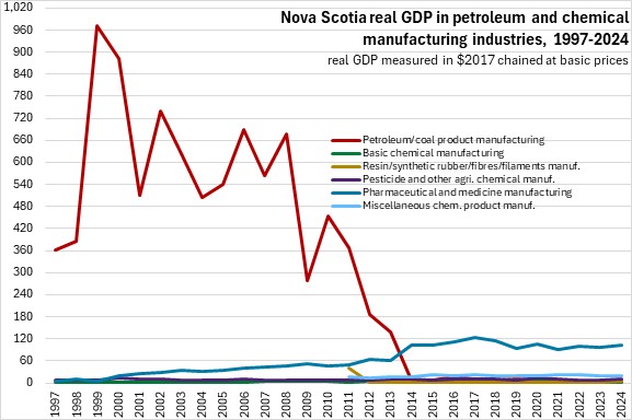With the closure of the Dartmouth refinery in 2013, Nova Scotia's real GDP from petroleum product manufacturing fell to zero (it had been contracting for several years before that). There has been a steady increase in real GDP from Nova Scotia's pharmaceutical and medicine manufacturers.