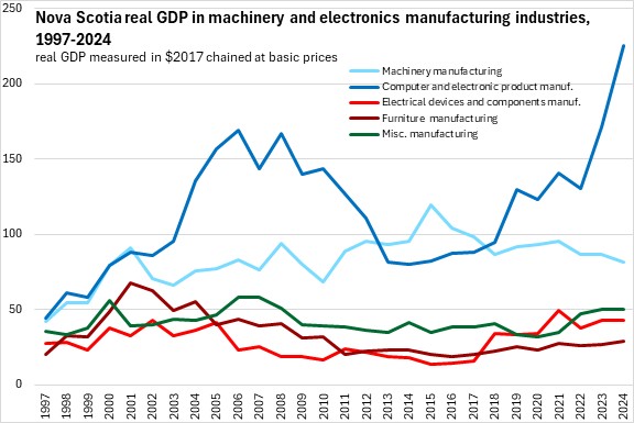 Nova Scotia's computer and electronic product manufacturers experienced declining real GDP from 2006-2017, but have rebounded in the years since with particularly strong growth in the last two years.