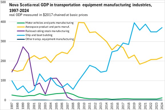 Nova Scotia's ship and boat building real GDP has grown substantially since 2008 while Nova Scotia's aerospace/parts producers have trended down since 2010 with some recovery since 2020.