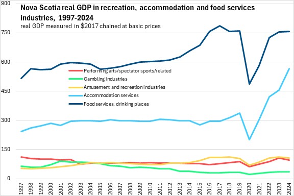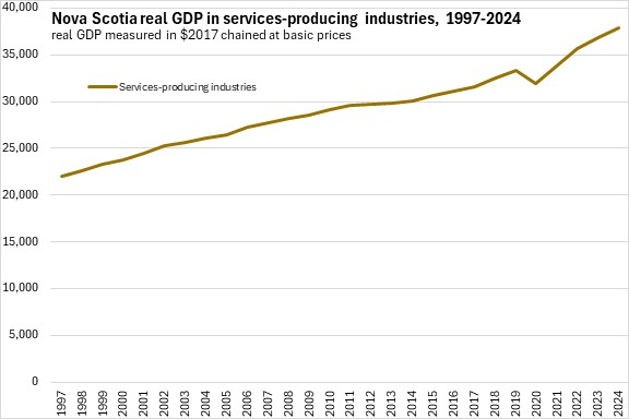 Real GDP from Nova Scotia's services-producing industries (including public sector) has risen steadily in most years with the exception of 2020.