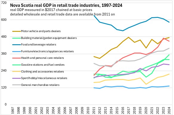 In retail trade, recent real GDP growth for food/beverage stores has eroded over the last three years. Motor vehicles/parts dealers have experienced volatile real GDP since 2017. There has been recent increases in real GDP from health/personal care stores, gas stations and building materials/garden supply retailers.