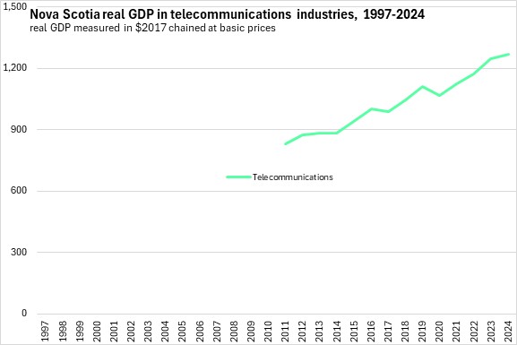 Telecommunications industries are by far the largest portion of Nova Scotia's information and cultural industries. With the exception of 2020, there has been steady and substantial growth in Nova Scotia's telecommunications real GDP since 2014.