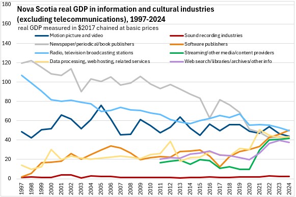 Among smaller industries in information and culture, there has been declining real GDP from radio/television broadcasting, newspapers, periodicals/book publishers, and motion picture and video. Web search/libraries/archives, software publishers and streaming services have reported increased real GDP in the last 10 years.