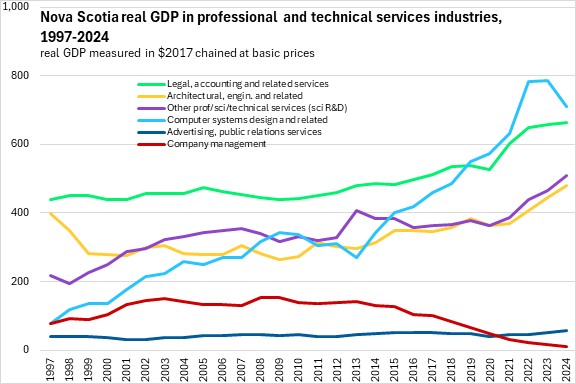 Professional and technical services in Nova Scotia accelerated during the pandemic, particularly for computer systems design. In 2024, computer systems design reported its first decline in real GDP since 2013. There have been increases in real GDP for legal/accounting and architecture/engineering (except in 2020). However, there have been steady declines in real GDP from company management in Nova Scotia (which is not categorized as part of professional/technical services).