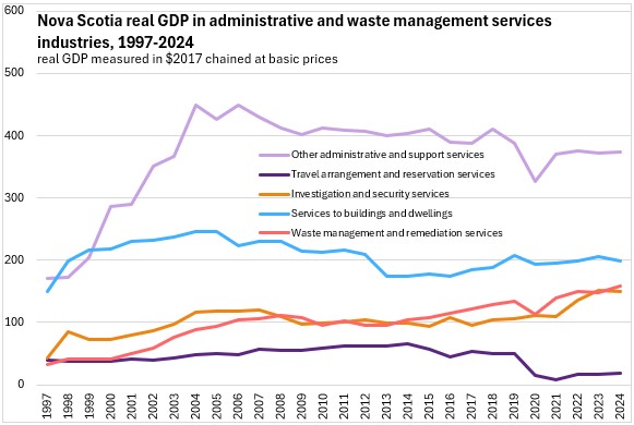 After rising rapidly from 1998-2004, there has been a protracted decline in real GDP from "other administrative/support" industries, which includes call centres. There have been gains in real GDP from investigation/security services and waste management/remediation. Travel arrangement services' real GDP fell sharply during the pandemic and has yet to post much recovery.