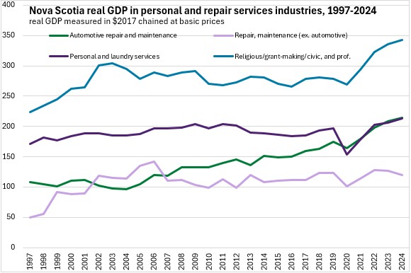 Among other services, there has been steady growth in real GDP from automotive repair since the early 2000s (despite a decline in 2024).