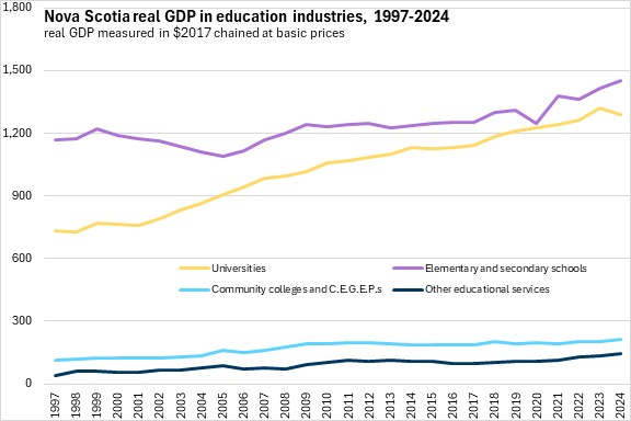 Nova Scotia's real GDP from education industries - which includes both public and private services - has increased largely on rising GDP from universities (along with elementary and secondary schools in since 2020).
