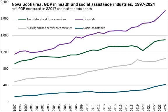 Real GDP from health care and social assistance (including both public and private industries) has been rising largely from hospitals and nursing/residential care facilities, though all subsectors have rising trends.