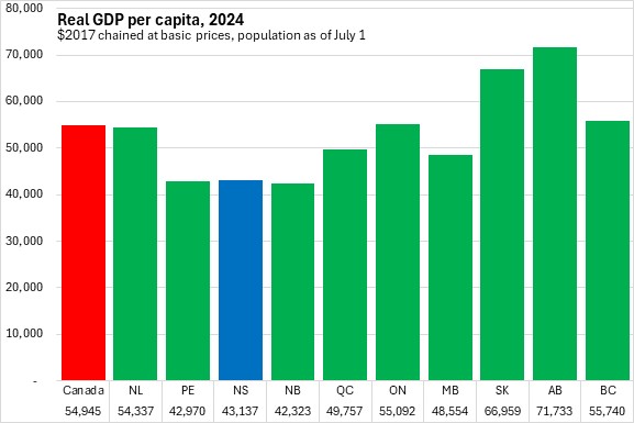 Nova Scotia has the third lowest real GDP per capita among provinces. The Maritime provinces have the lowest real GDP per capita, followed by Manitoba and Québec. Saskatchewan and Alberta report the highest levels of real GDP per capita among provinces. Real GDP per capita is similar to the national average in Newfoundland and Labrador, Ontario and British Columbia.