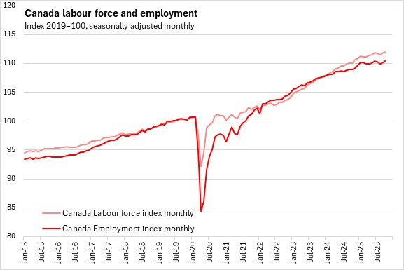 Source: UK Labour Market Statistics; UK Labour Market Data; Statistics Canada. Table 14-10-0287-01 Labour force characteristics, monthly, seasonally adjusted and trend-cycle, last 5 months