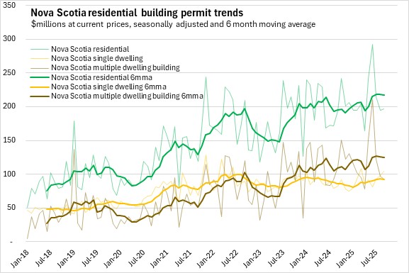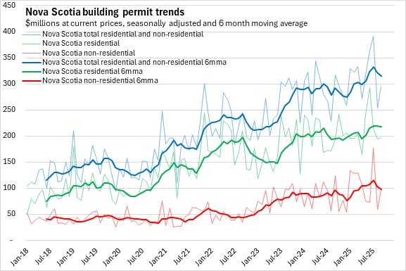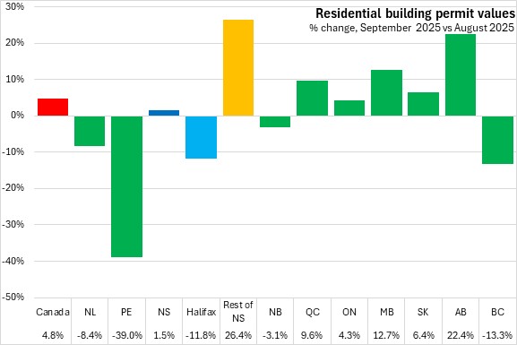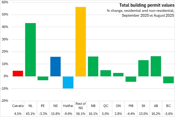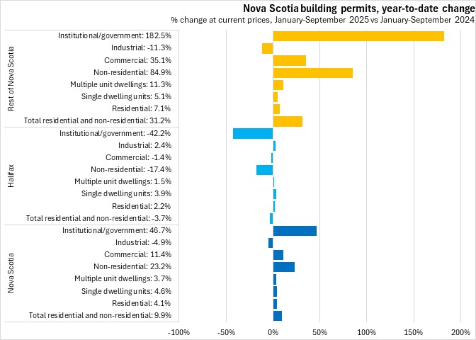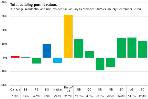 Nova Scotia's total building permits (residential and non-residential) were up 9.9% in the first nine months of the year comparing with the same period in 2024. Halifax permits declined 3.7% and outside the city permit values increased 31.2%. National permits were up 1.3%. Building permit values were up in seven provinces, with Saskatchewan, Alberta and New Brunswick reporting the fastest increases. Ontario reported the fastest decline.