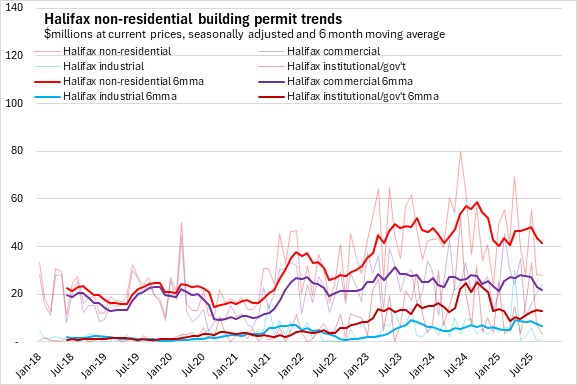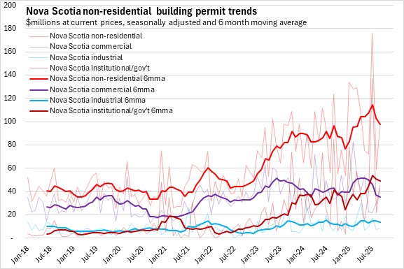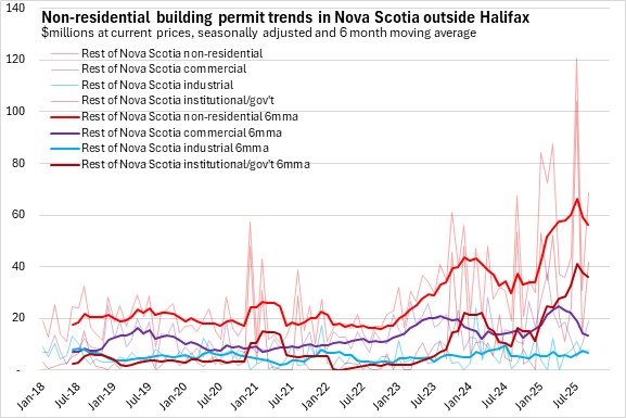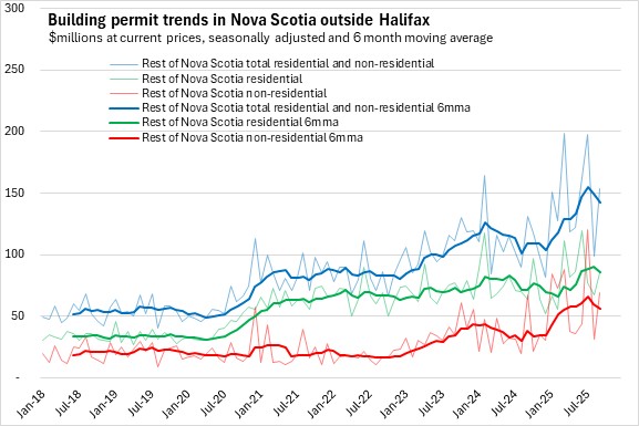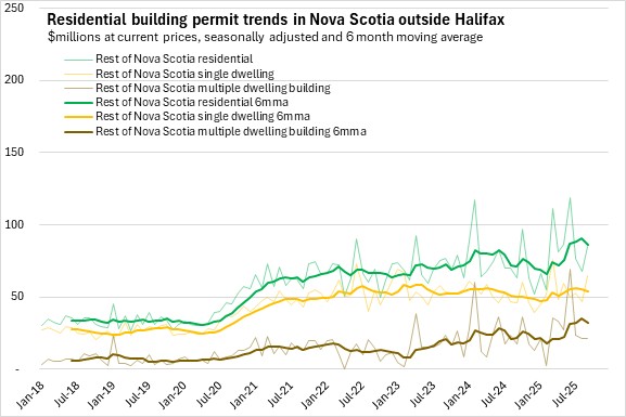 Nova Scotia's non-residential building permit values also reached a plateau from late 2023 through 2024. Non-residential permits have trended up in recent months due to notable growth outside the city.