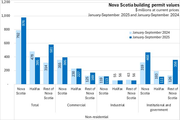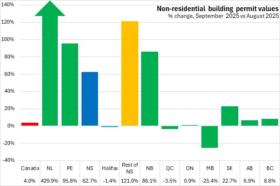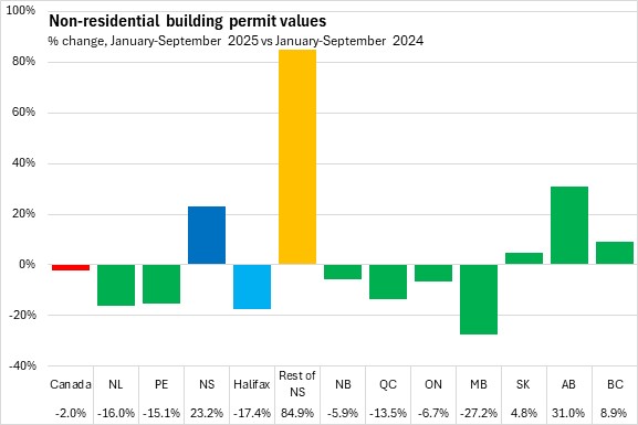 Nova Scotia's non-residential building permits rose 23.2% in the first nine months of 2025 (compared with the same period in 2024), the second fastest rise in non-residential permit values among provinces after Alberta. Halifax permits declined 17.4% while non-residential permits outside the city rose 84.9%. National non-residential building permit values fell 2.0% on declines in six provinces. Manitoba reported the steepest decline in year-to-date non-residential permit values.