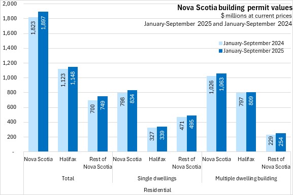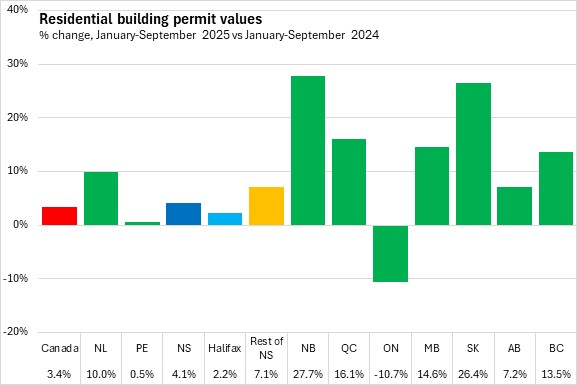 In the first nine months of 2025, Nova Scotia's residential building permits rose 4.1% compared to the same period in 2024. Halifax residential permits rose 2.2% and outside the city residential permit values increased 7.1%. National residential building permit values increased 3.4%. Residential permit values were up in all provinces except Ontario, with the fastest increases in New Brunswick and Saskatchewan.