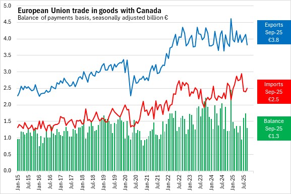 - the European Union's surplus in goods trade with Canada narrowed by €433.4 million to €1.3 billion.