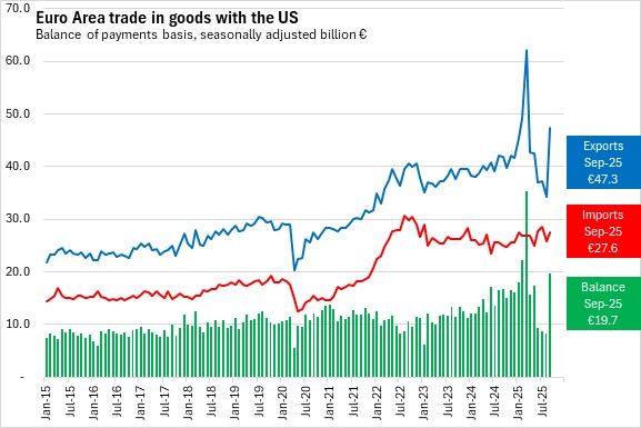 - the Euro Area surplus in goods trade with the US widened by €11.3 billion to €19.7 billion.