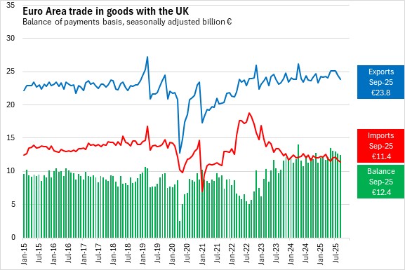 - the Euro Area surplus in goods trade with the UK narrowed by €278.1 million to €12.4 billion.