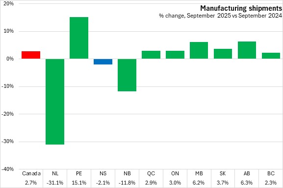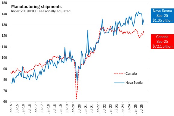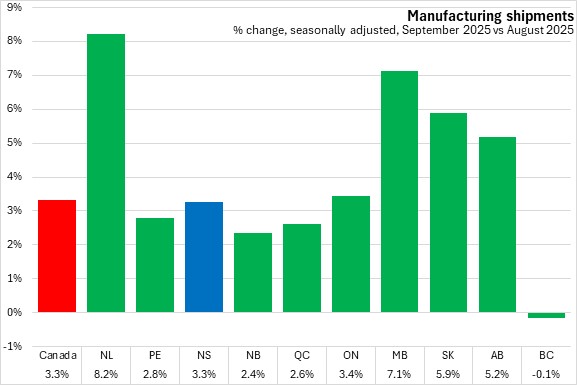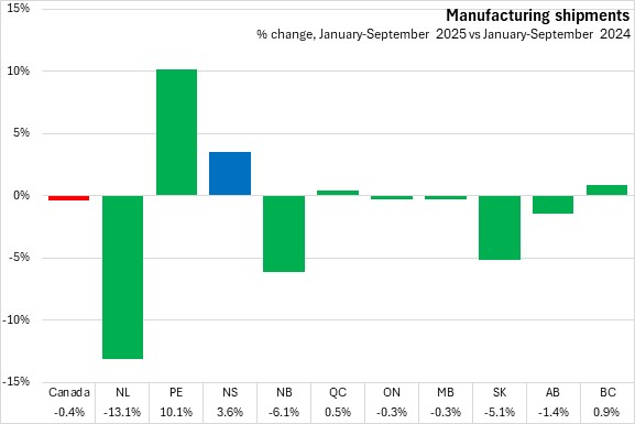 Nova Scotia's manufacturing shipments increased by 3.6% compared to the same period in 2024. National shipments decreased 0.4%. Four provinces reported increases, led by Prince Edward Island. Six provinces led by Newfoundland and Labrador reported declines.