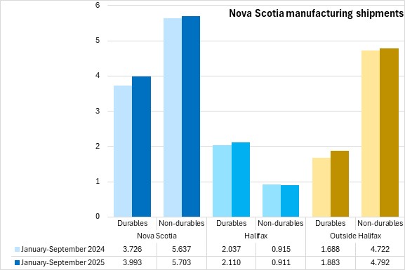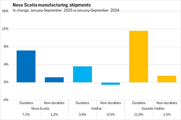 Nova Scotia's year-to-date durable goods shipments increased 7.2%, while non-durable goods shipments increased 1.2% in the same period. In Halifax, durable goods shipments increased 3.6% and non-durables declined 0.5%, year-to-date. Outside Halifax, durables rose 11.6% while non-durables increased 1.5%.