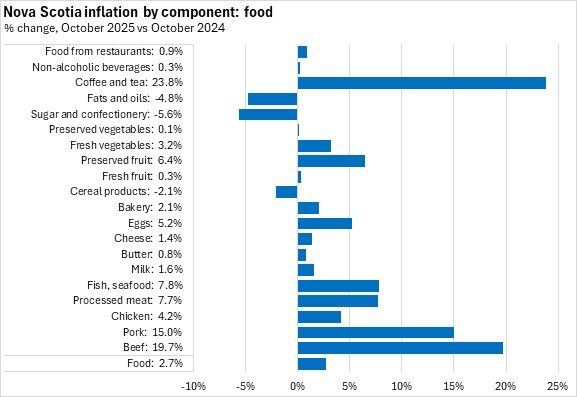 Among detailed food products with available data, Nova Scotia's year-over-year inflation was fastest for coffee/tea, beef, and pork. The largest year-over-year price declines were for sugar/confectionery and fats/oils.