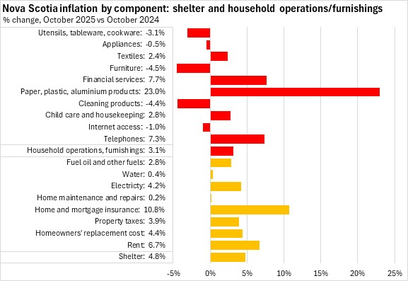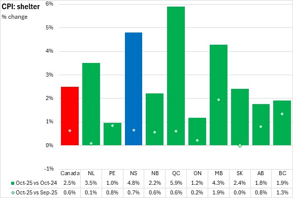 Year-over-year shelter cost inflation was 4.8% in Nova Scotia in October 2025. National shelter prices were up 2.5% with increases in all provinces. Québec had the largest increase in shelter prices, while Prince Edward Island reported the slowest increase.