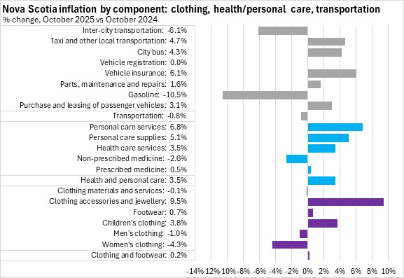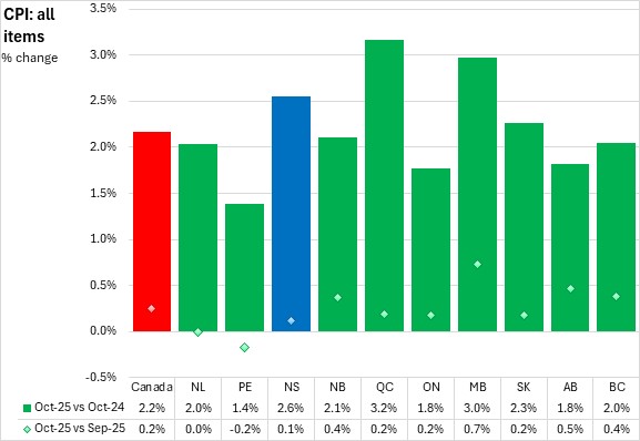 On a monthly basis, Nova Scotia's all items CPI was up 0.1% from September 2025 to October 2025. National prices were down 0.2% on average. There were price increases reported in eight provinces (led by Manitoba), and a decline in Prince Edward Island, while prices in Newfoundland and Labrador were unchanged month-over-month.