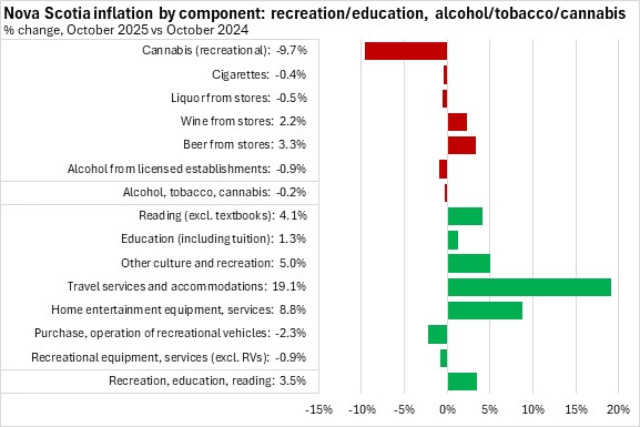 Nova Scotia's prices for alcohol, tobacco and recreational cannabis were down 0.2% year-over-year, with an increase in prices for beer and wine from stores offset by declines in all other categories, led by recreational cannabis.