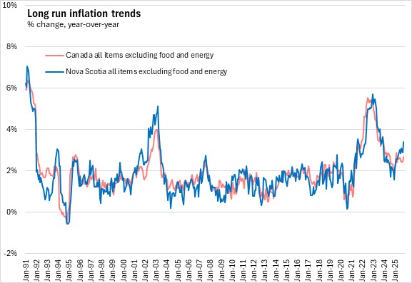 Many of these periods of accelerated and slowed inflation are attributable to volatile commodity prices, especially energy prices. Once the more volatile commodity prices are excluded, inflation in Nova Scotia has largely been below 2% for much of the last 20 years. However, the recent rise in inflation through 2021-2024 spread beyond commodity prices, resulting in the longest period under the Bank of Canada's inflation-targeting regime with Nova Scotia's CPI excluding food and energy above 3%.