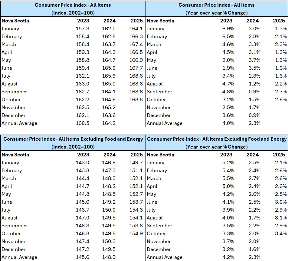Nova Scotia’s all items Consumer Price Index (CPI) grew 2.6% year-over-year in October 2025, down 0.1 percentage points from the previous month.