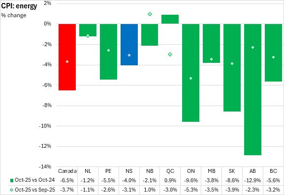 On a monthly basis, Nova Scotia's energy prices fell 3.1% from September 2025 to October 2025. National energy prices were down 3.7% with nine provinces reporting lower prices compared to the previous month. New Brunswick reported a monthly increase in energy prices, while Ontario reported the fastest decline.